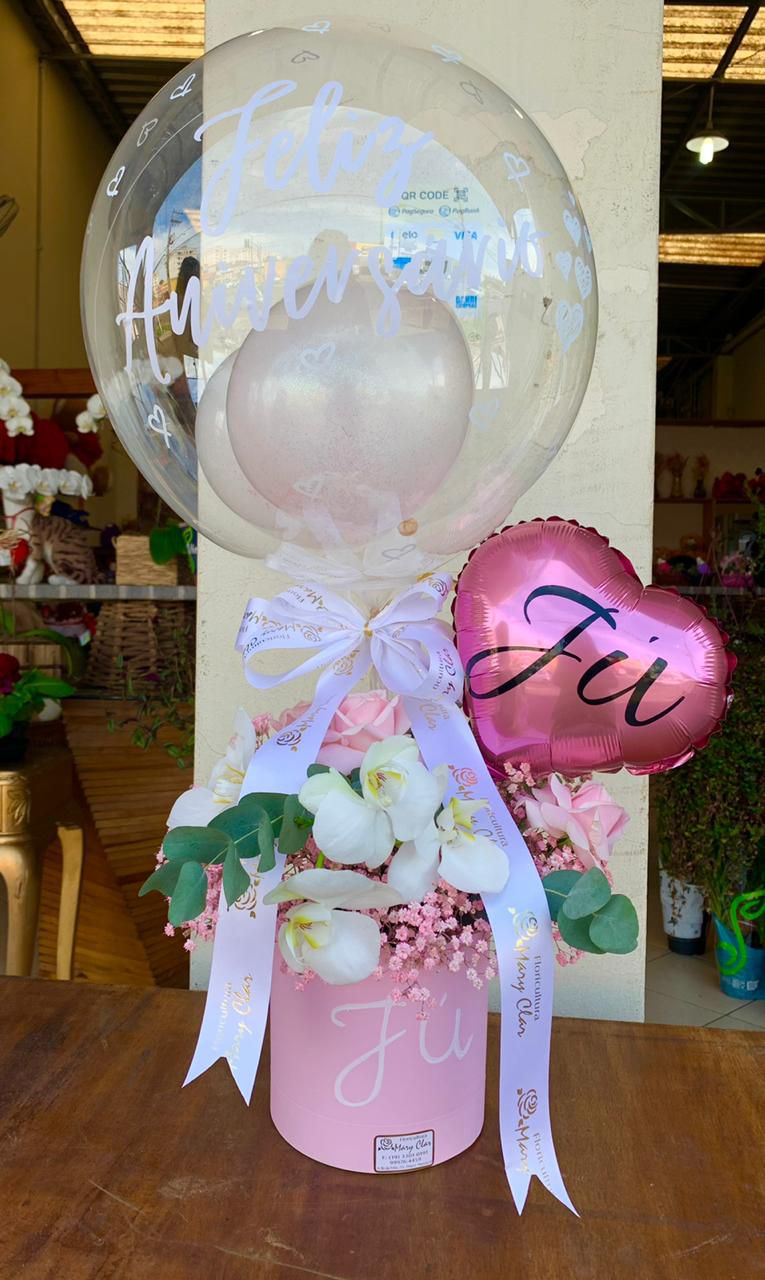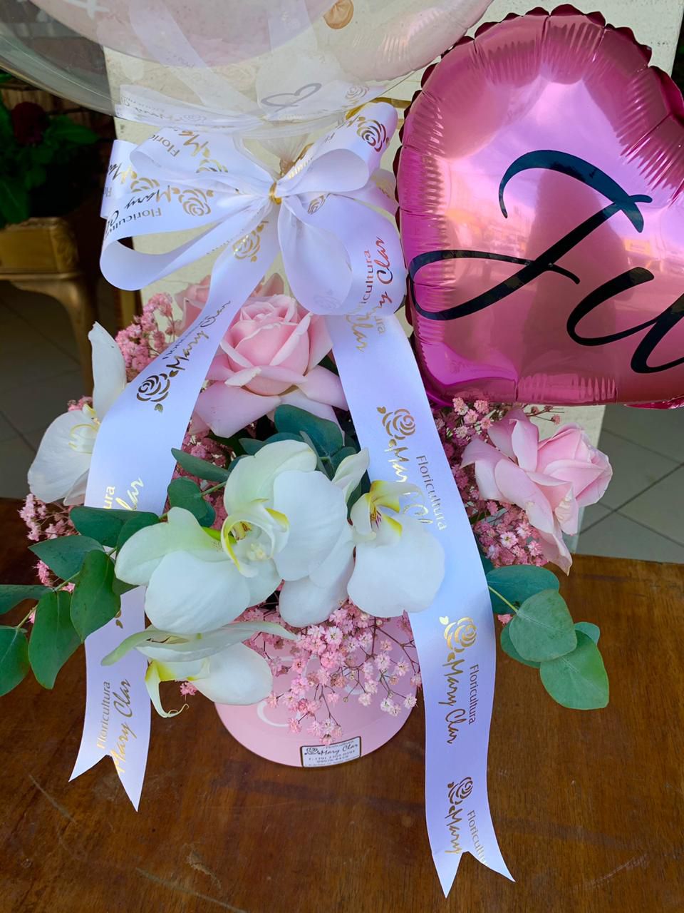 Esse é um Box Flowers em rosê com arranjos de rosas, orquídea, gipsofila e eucaflor. Além de acompanhar um balão bubble personalizado e um balão de coração metalizado.